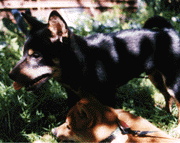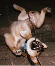 After that we went to puppy K together and boy, the both of us could terrorize the whole place! We never did finish puppy K, I'm not sure why exactly. Now we're going to novice dog school - mom thinks we're going to be Utility Dogs someday. I think dad's been putting funny colored things in her food. We've both been doing much better in novice school though, the other dogs are much more friendly then the ones in puppy K, so we don't have to attack them all the time.